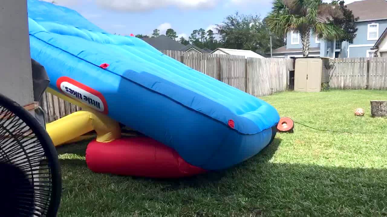 A man climbs out of a kiddie pool in the yard and then jumps into a bounce castle. He slides across the castle and hits the wall on the other side and flips the whole thing over.
