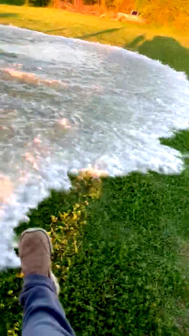 A man breaks open an above-ground swimming pool in a backyard and the water rushes out and the pool breaks. His family laughs and a tot boy floats in the water in an inflatable float.