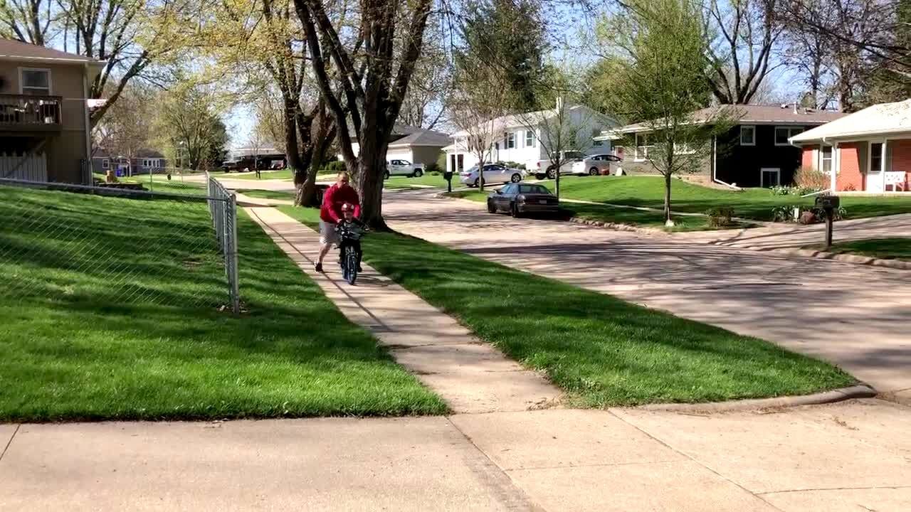 A man runs alongside his young son riding on a bicycle, but once the man lets go the boy falls over and the man then trips over the boy and falls too.