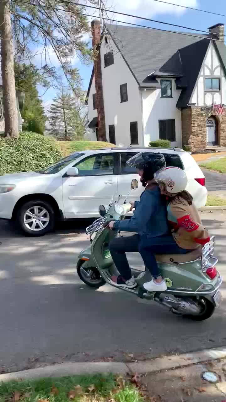 A man and teen girl ride a Vespa out of a driveway onto a street and immediately crashes into a parked car and fall down.