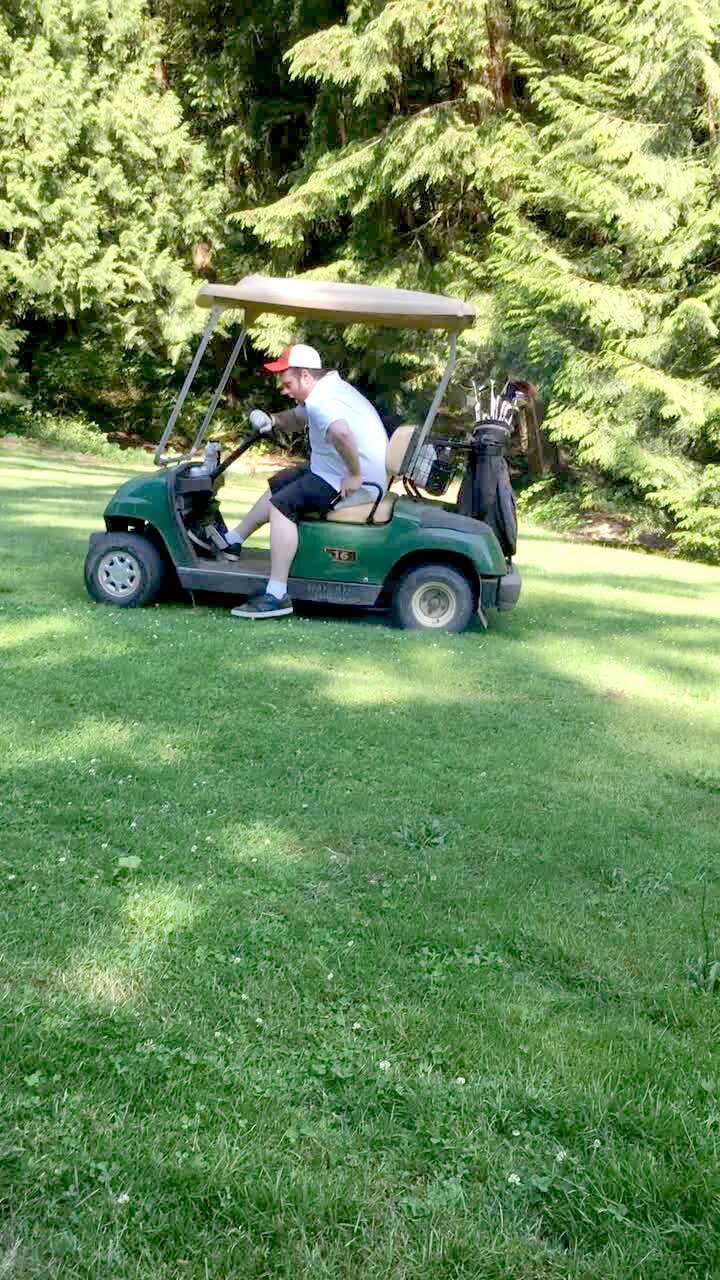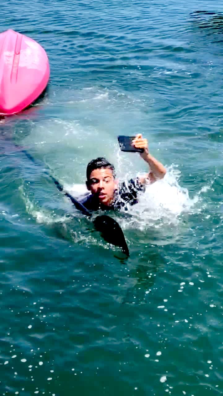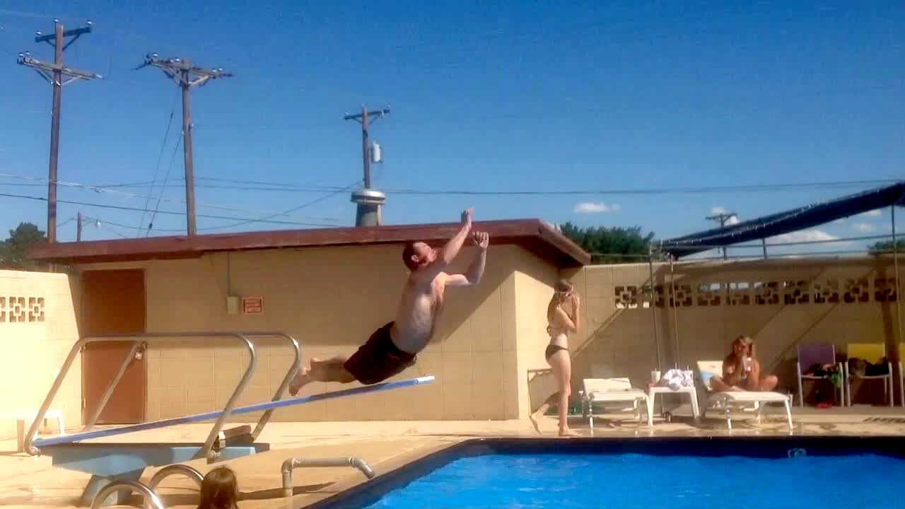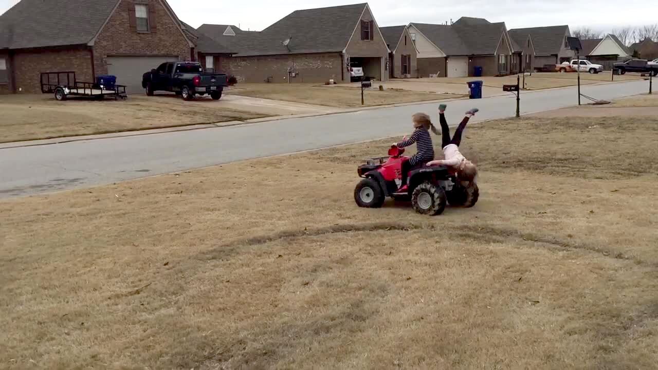 A teen boy swings on a playground swingset swing. He jumps onto a small toy plastic house, breaks the house, and falls hard on the ground. A young girl yells at him "You wrecked the house." Featured talent cleared (the boy who destroys the house).