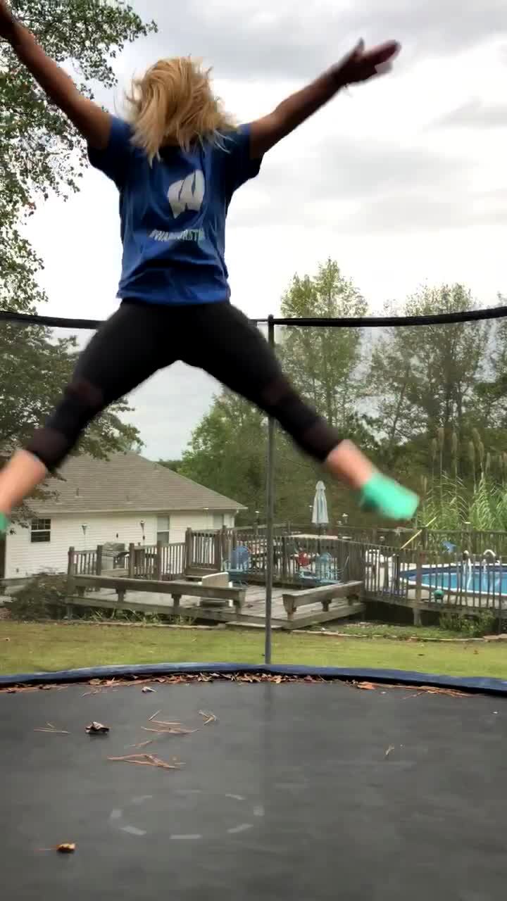 A woman jumps on a trampoline in the yard and it tears and she falls through.