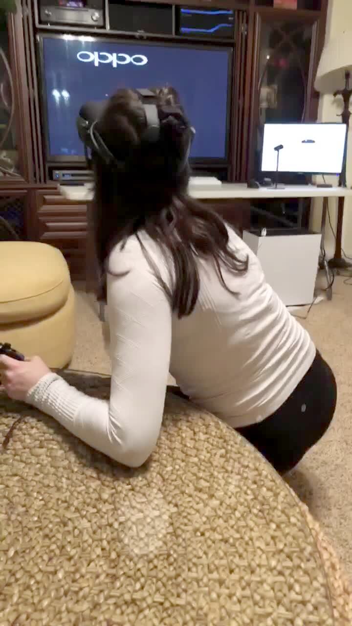 A teen girl plays a virtual reality video game in the living room. She runs forward and crashes into the table that the monitor is set on and knocks everything down.