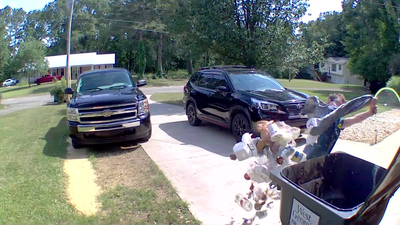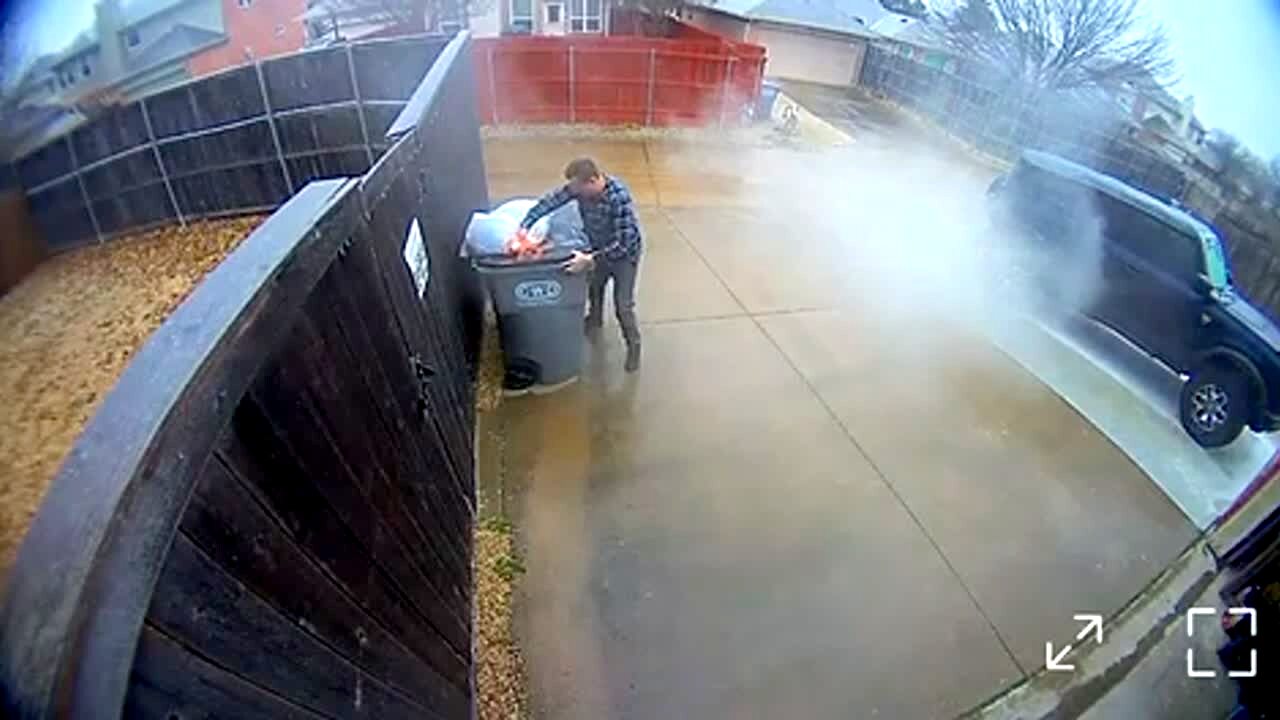 A man slides on ice to take out the trash on a driveway, but he slides past the trash can. Security footage.