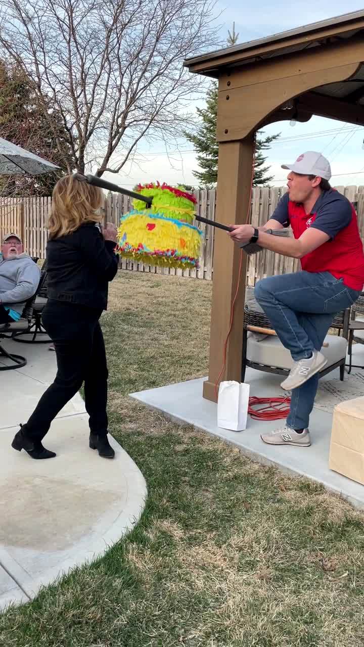 A man holds a pinata out for a woman and she swings and loses her grip and throws the stick into the mans chest.