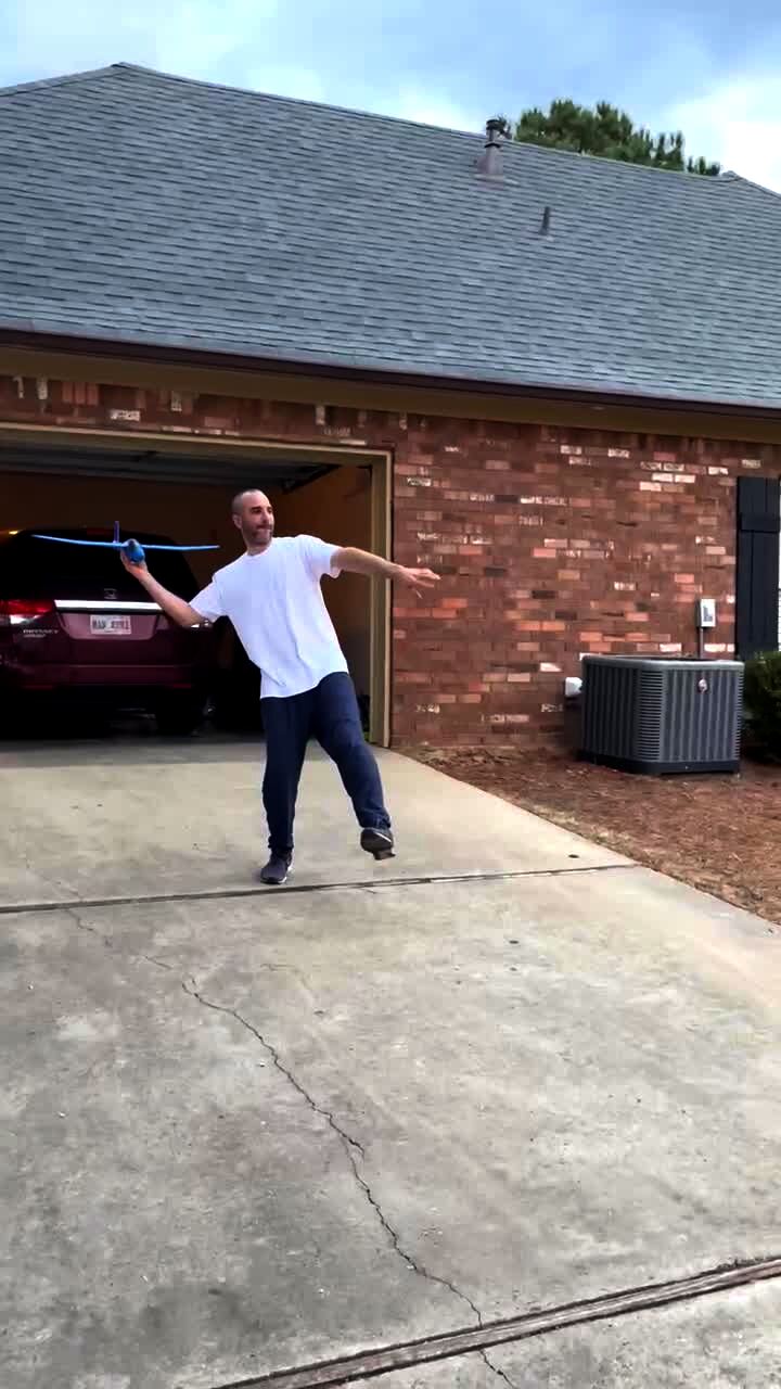 A man throws a toy plane in the driveway. It spins around and hits him in the face.