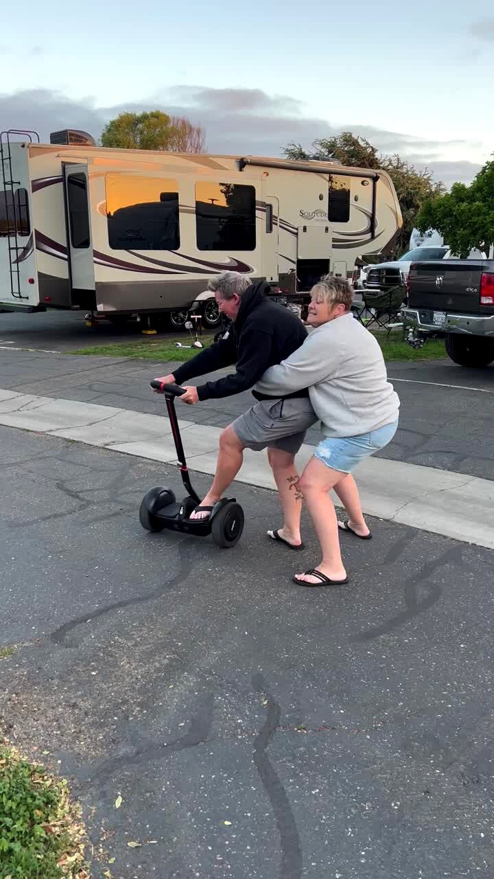 A woman tries to help another woman ride a segway outside. They both fall over on top of each other.