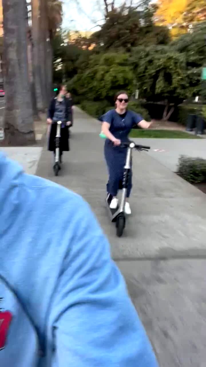 A woman rides a scooter and falls on the sidewalk outdoors.