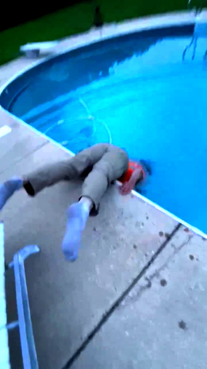 A young man says that he likes to ride his hoverboard backwards in a yard, then he falls off of it, and the hoverboard falls into a swimming pool.