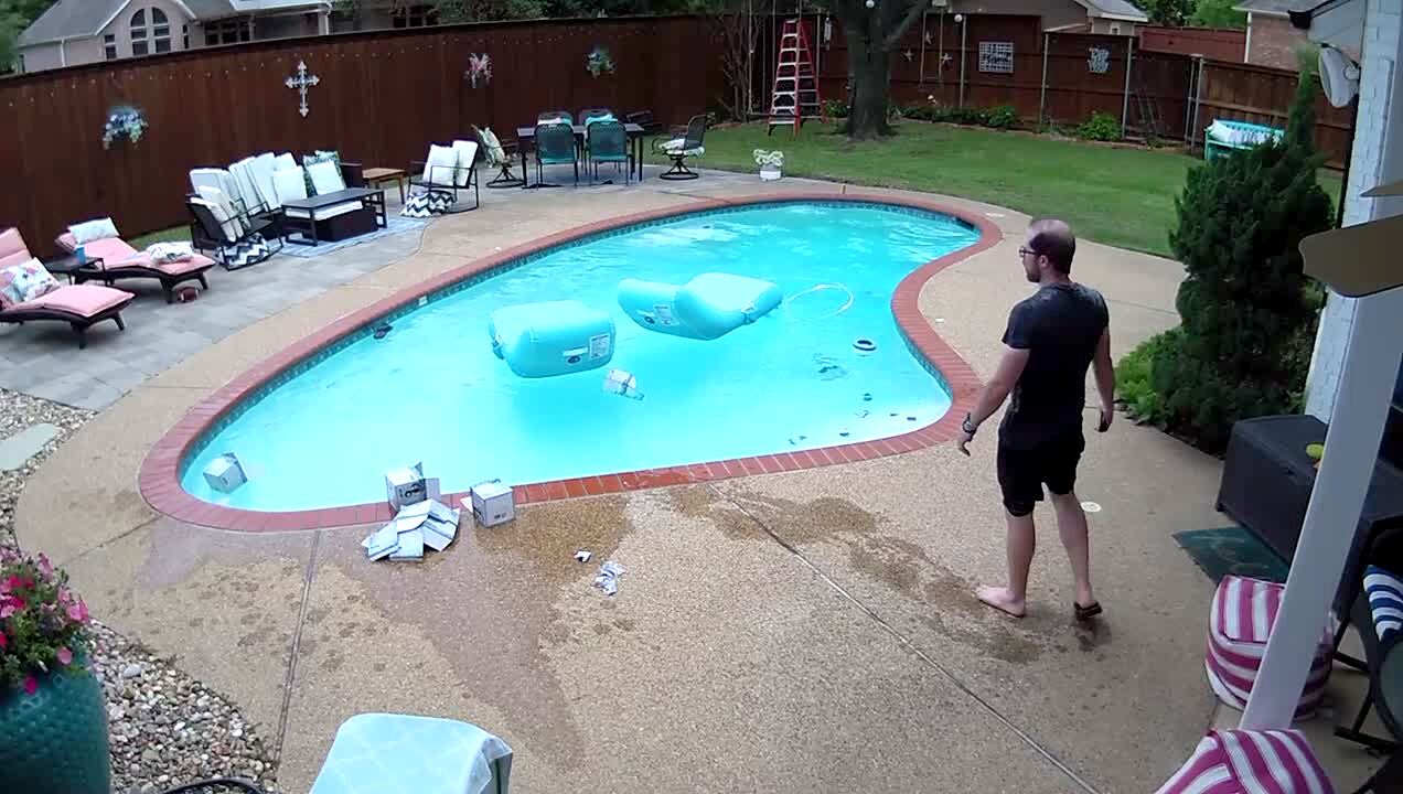 A man falls into a pool with a stack of empty boxes in his hands. Security footage.