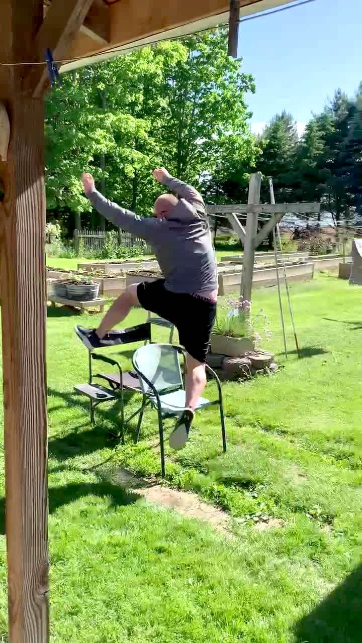 An adolescent boy jumps over two chairs in the yard then his uncle tries to do the jump as well. The man gets his leg caught in a chair and falls to the ground
