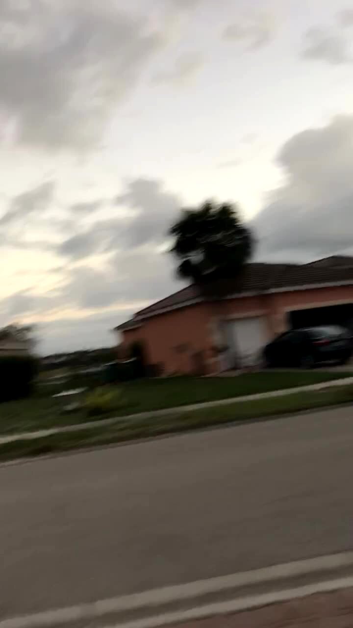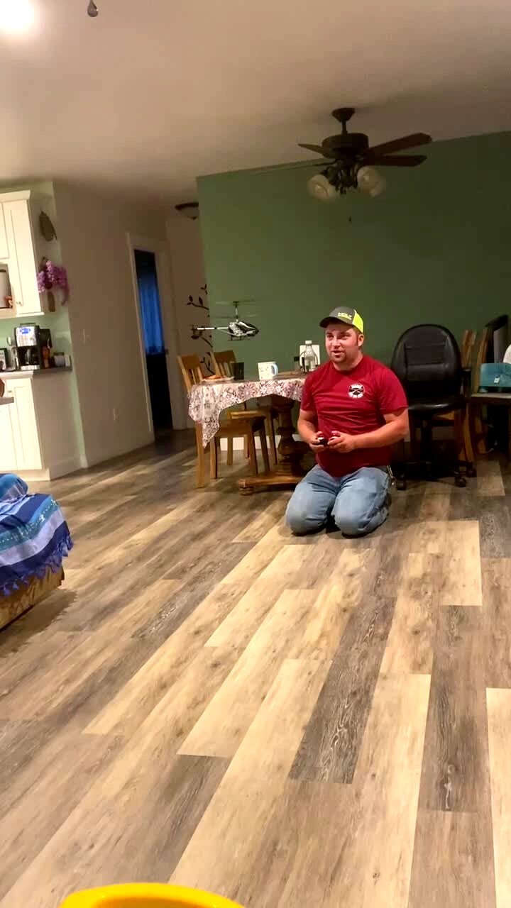 A man laughs in the driveway when a drone gets stuck in his wife's hair while he flies it.