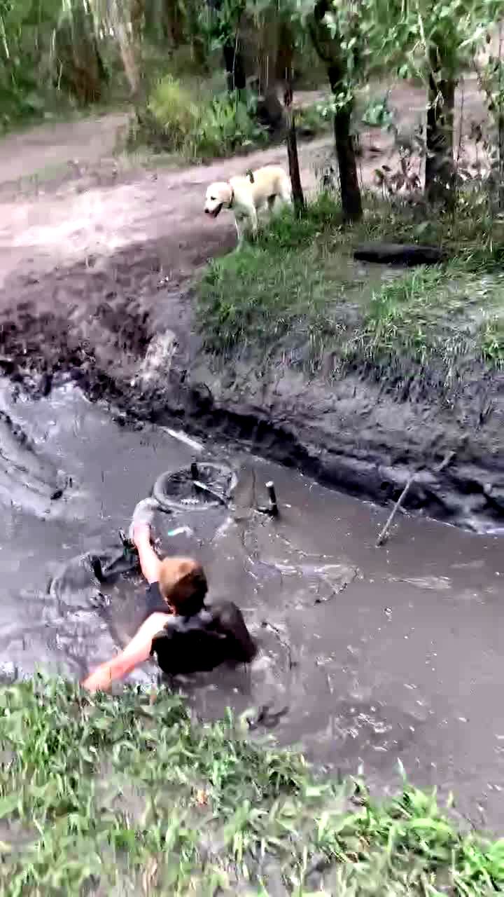 A young boy rides a bicycle and falls into a pit full of mud outdoors.