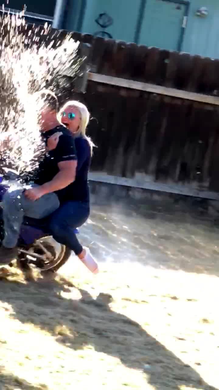 A man and a woman ride on a mini-bike and crash and fall down and their family laughs in a backyard.