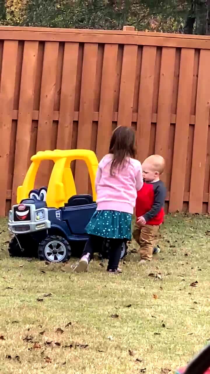 A young girl climbs over a toy car outside with a ball. Then she drops the ball and the car falls over and she falls to the ground.
