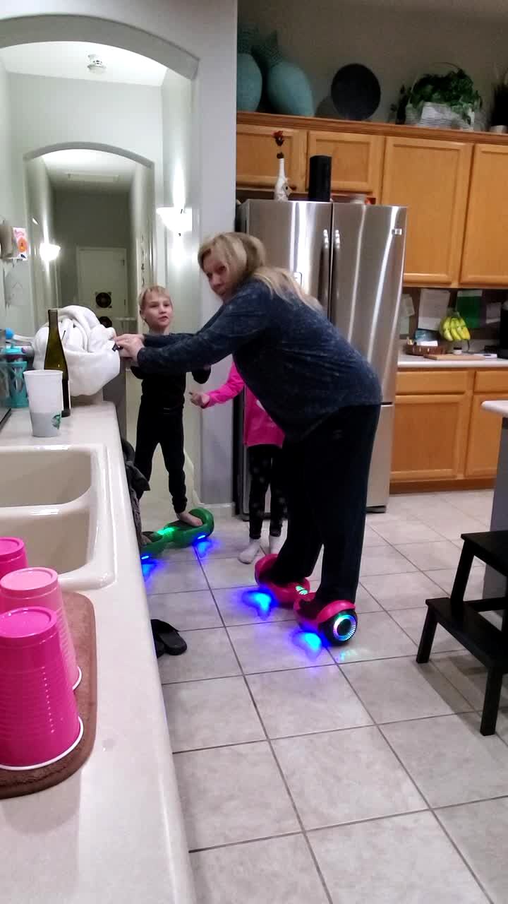 A woman in a kitchen stands on a hoverboard in a kitchen and falls hard and knocks over a young girl.