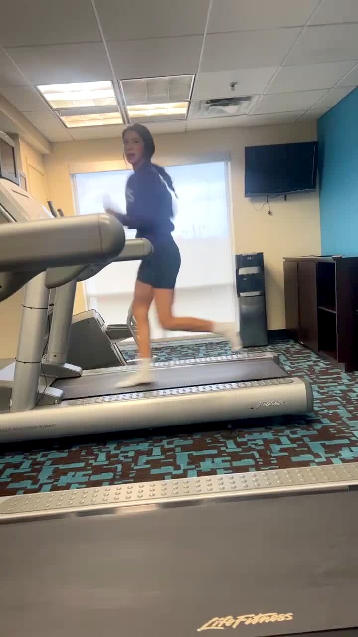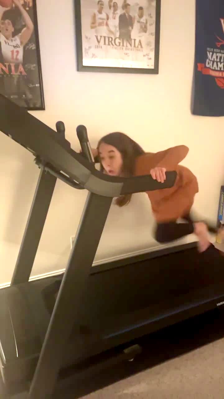 A teen girl attempts to run on a treadmill and falls off, sliding backwards.