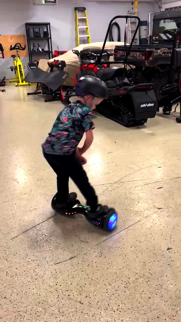 A young boy dances on a hover board before he eventually falls to the ground. Music rights not cleared.