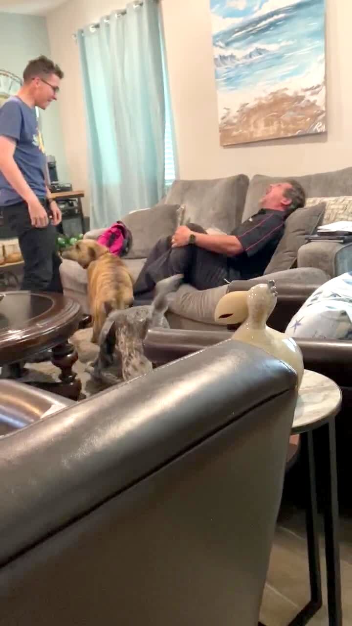 A dog bites a man's toe when his son comes come from the military because everyone starts screaming. The man says "I'm sorry son that's a great surprise, the dog tried to eat my toe" in the living room.