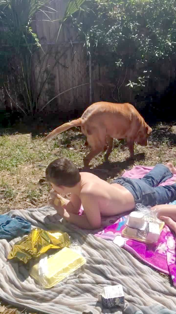 A dog poops next to a young girl and boy as they have a backyard picnic, then he kicks dirt onto them as he tries to cover his mess.