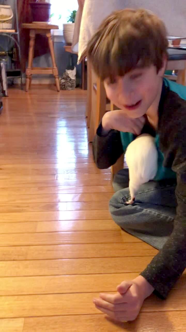A guinea pig climbs into a young boy's shirt and pees while his mother laughs off screen.
