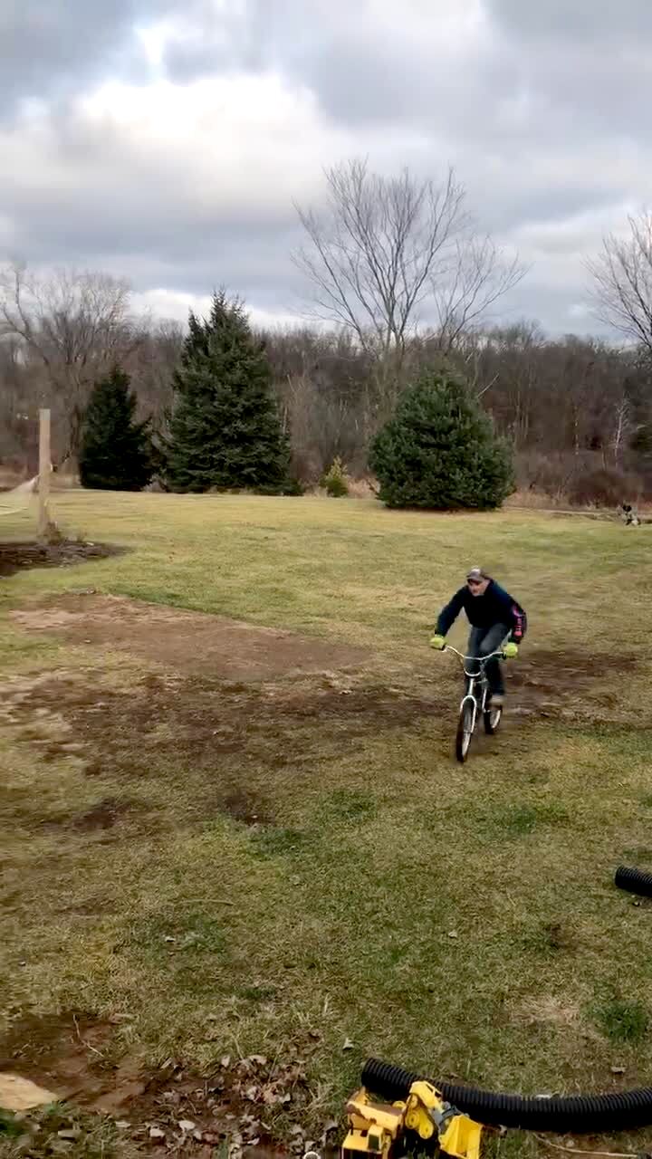 A man rides a bike up a ramp and hits his face on the side of a truck in a yard.