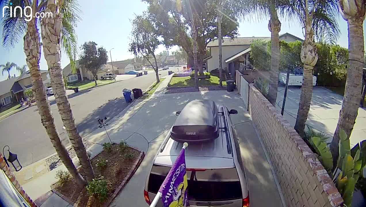 A woman backs an SUV truck into driveway and straight into a horizontal flag pole that pierces into the roof rack.