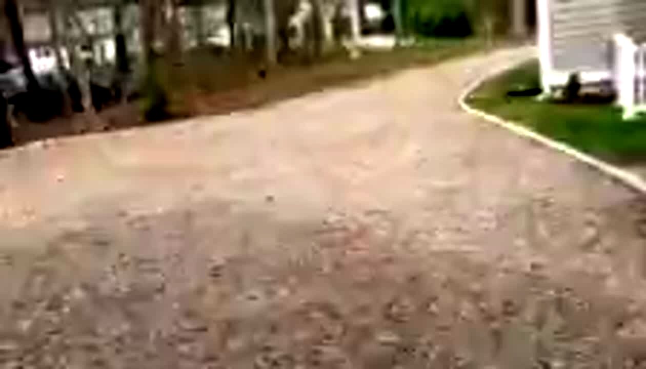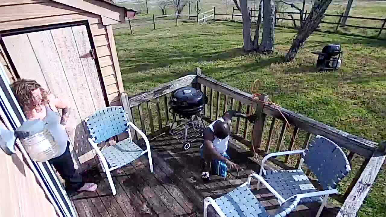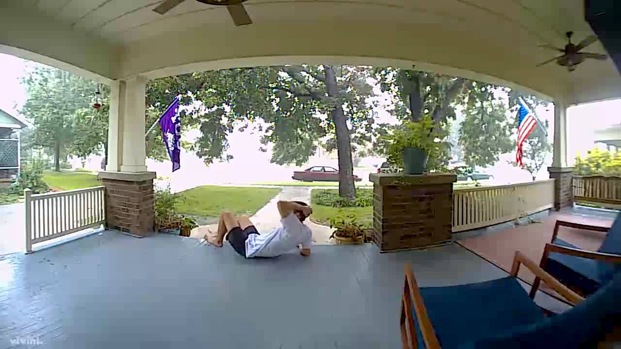 "Bested by a Bug" A man tries to kick a bug off of a patio porch and he slips and falls. Home security footage.