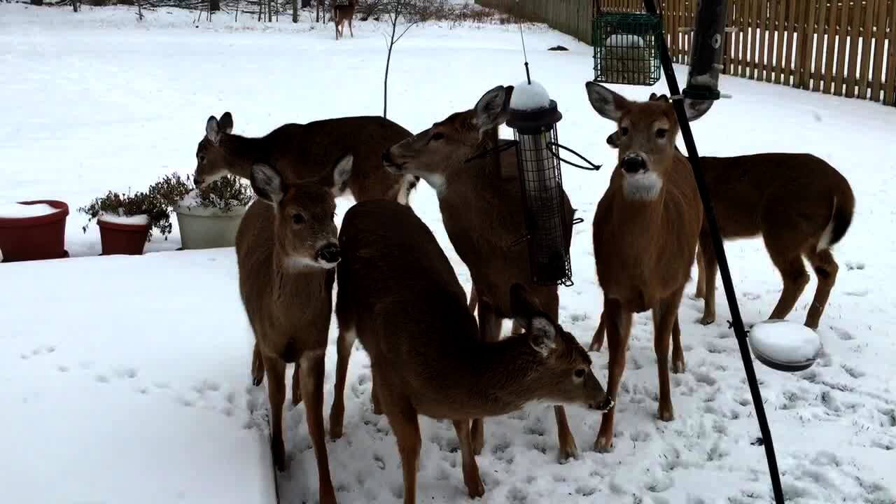 "Deer Sneeze Snafu" A group of deer eating from a bird feeder all run away when a man sneezes. A woman lectures the man for sneezing and the two argue.