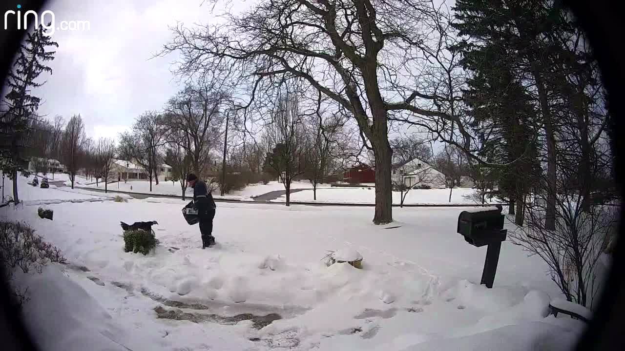 A mailman barks at a turkey and the turkey flies at the man and knocks him down into the snow. The man continues to yell at the turkey and the turkey continues to fly at him. Video repeats.