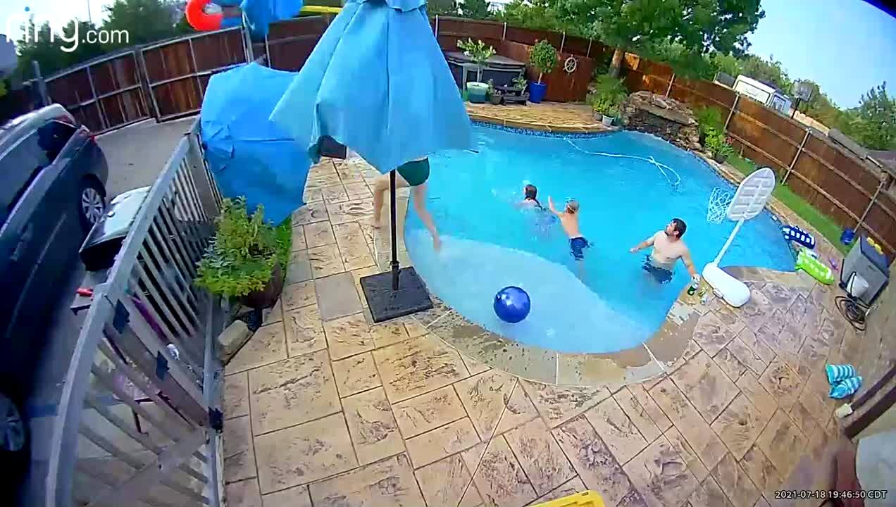 A wind takes a bouncy castle out of a yard and a woman in a pool chases after it, then she trips and falls on a patio. Security camera footage.