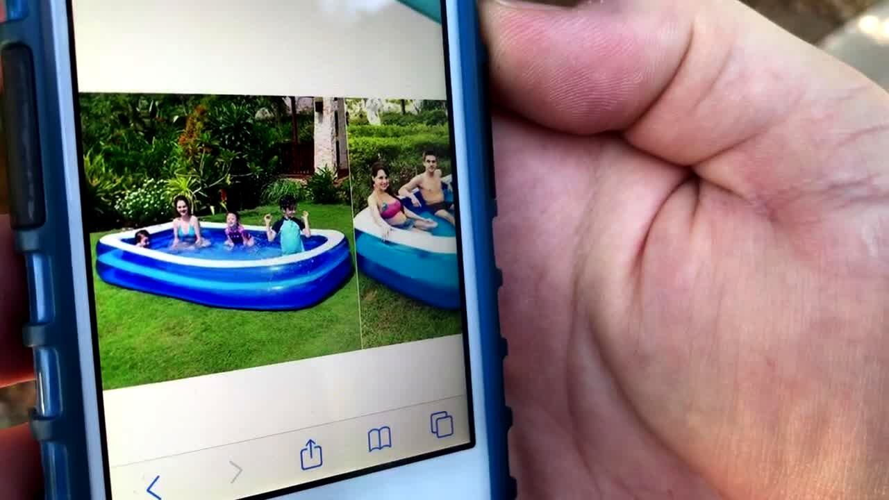 A woman with the camera in a yard shows a 7-person inflatable pool on her phone that she bought. The camera pans to the pool that they received and it can barely fit a young boy and young girl inside. A man behind the camera points out that it says no diving.