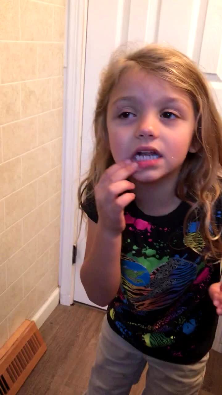 A young girl laughs when she tries to spit her tongue out with a numb face in the bathroom. She repeatedly says "look at your face", and her tongue spits out the side of her mouth.