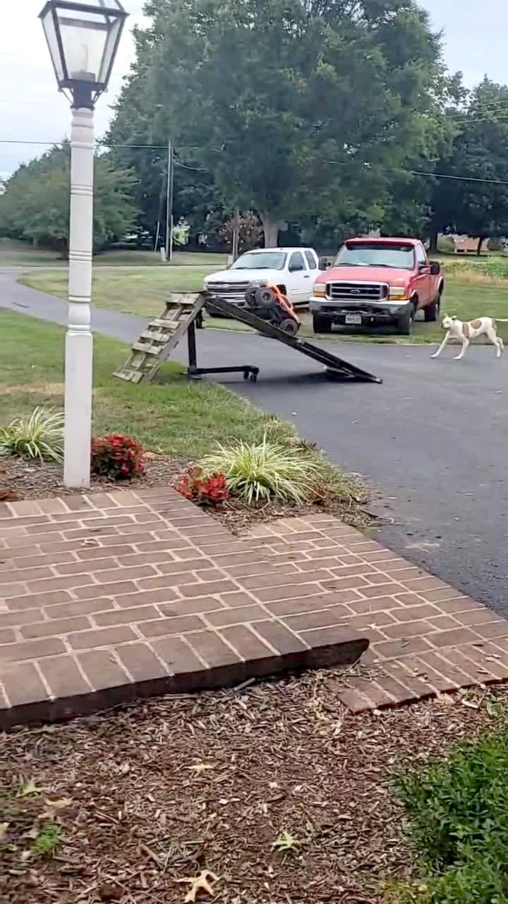A man drives a remote control car up a ramp where it jumps into the air and hits a young boy.