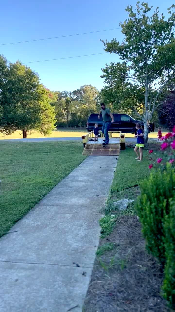 A young girl repeatedly stops and starts as she tries to jump from one hay bale to another. When the girl jumps, she falls short and hits the ground.