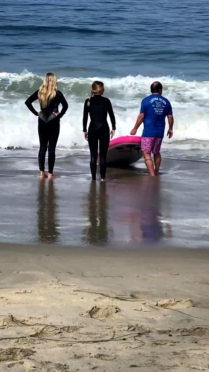 A man holds a surf board and a stands next to two women and a wave hits the board and pushes it and it hits one of the girls in the head and she falls in the ocean.