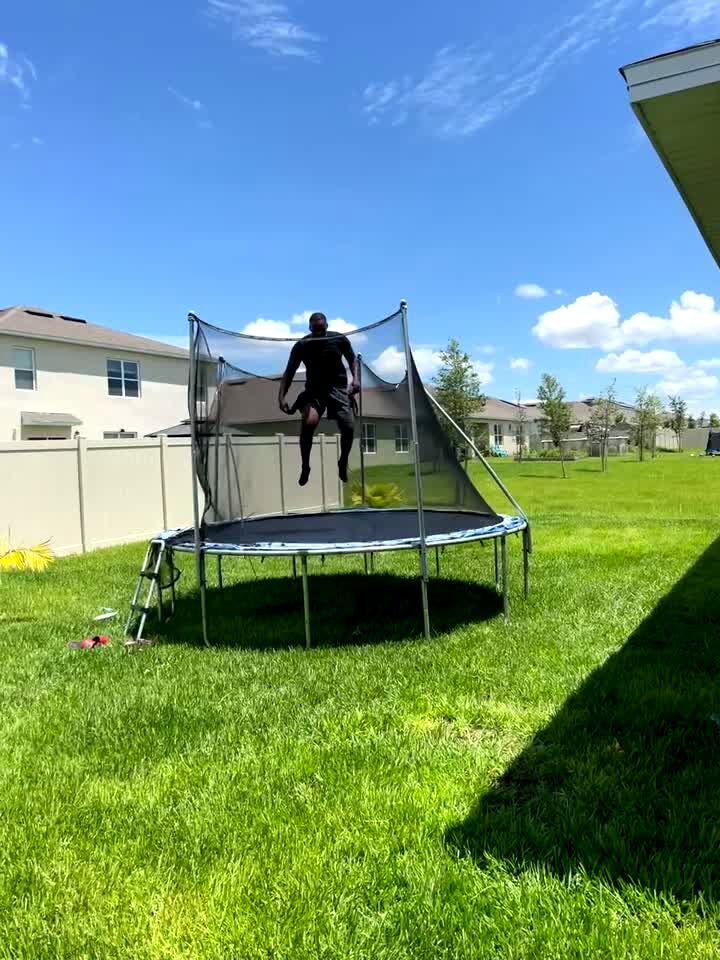 A man jumps on a trampoline and breaks it, falling through the bottom.