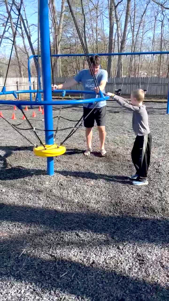 A young boy hangs on a ride that spins, then dad spins it and flings the boy away at the playground.
