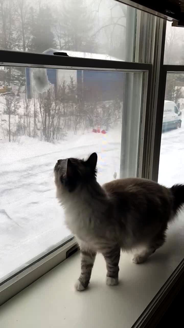 A cat paws at a window when a snow ball hits the pane and it scares the cat causing it to fall to the ground.