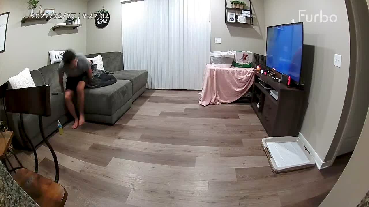 A man gets up from a couch to check on a puppy dog in a crate, then he slips and falls hard on a living room floor. Security footage.