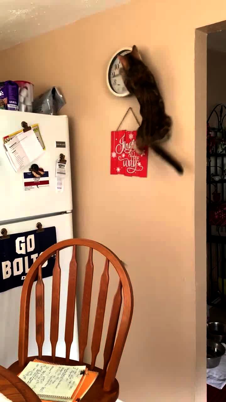 A cat jumps on to the back of a dining room chair. The she jumps towards a clock on the wall and falls.