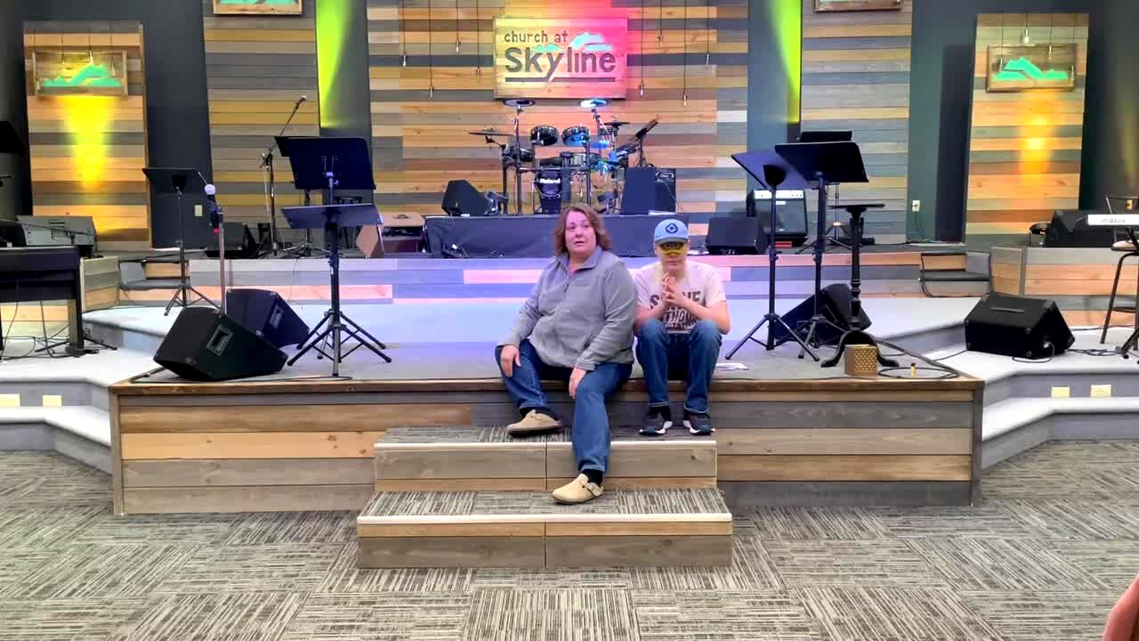 A man wearing Heelys shoes slips on the carpet while trying to skate over to a woman and teenage boy at a church. In pain he yells "help me Jesus" while they laugh.