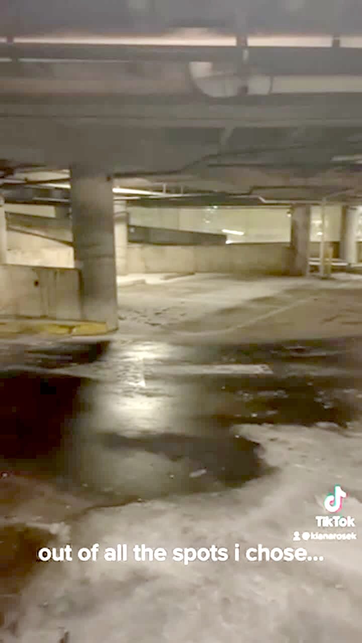 A car has frozen water from a busted pipe all around it in a parking garage. Music rights not cleared.