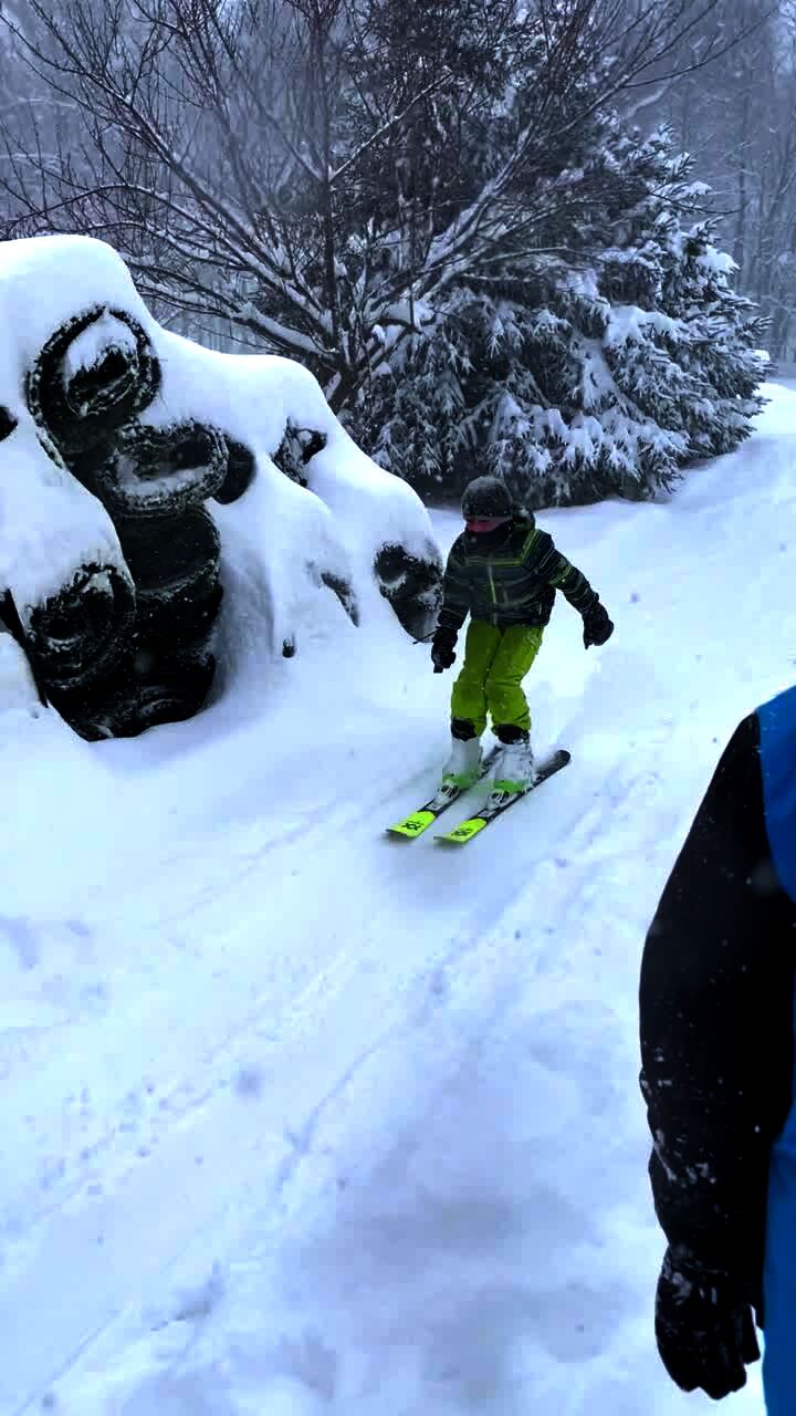 A teen boy on skis tries to do a backflip off a snow jump and lands on his neck in a yard.