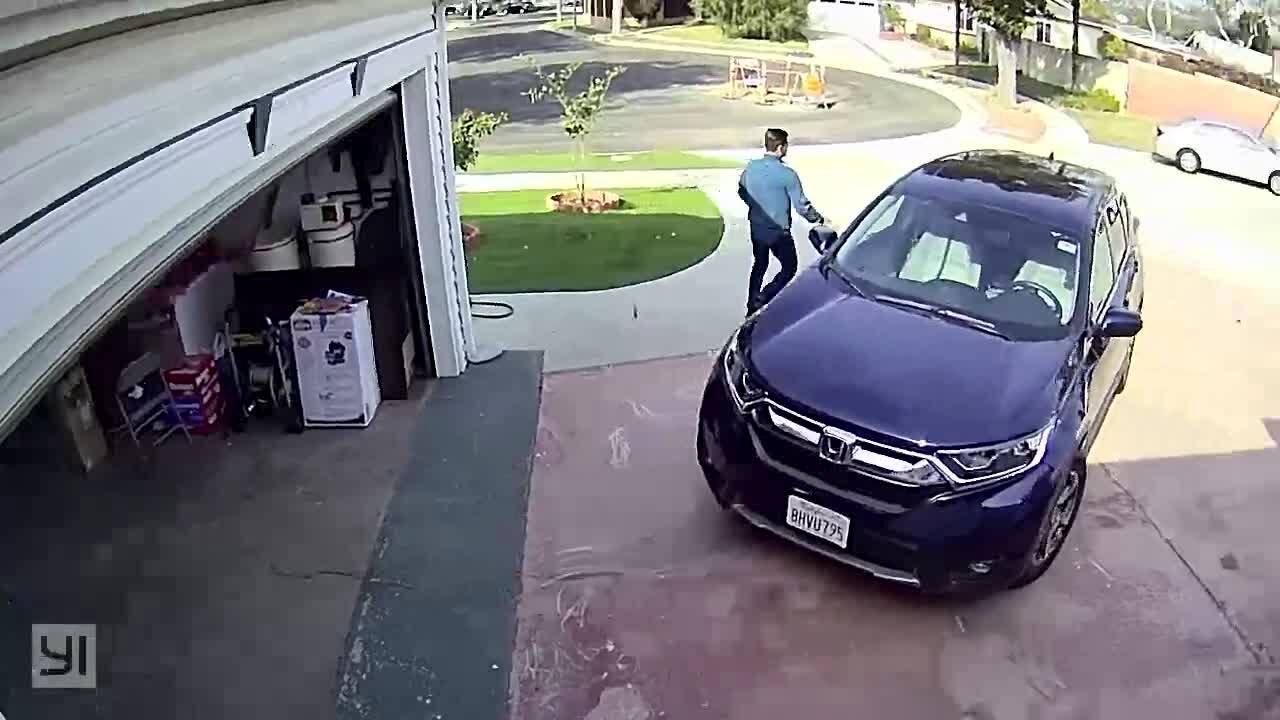 A man chases after his car as it rolls down the driveway and he tries to stop it. He opens the door and falls in the street while the car crashes into construction cones. Security footage.