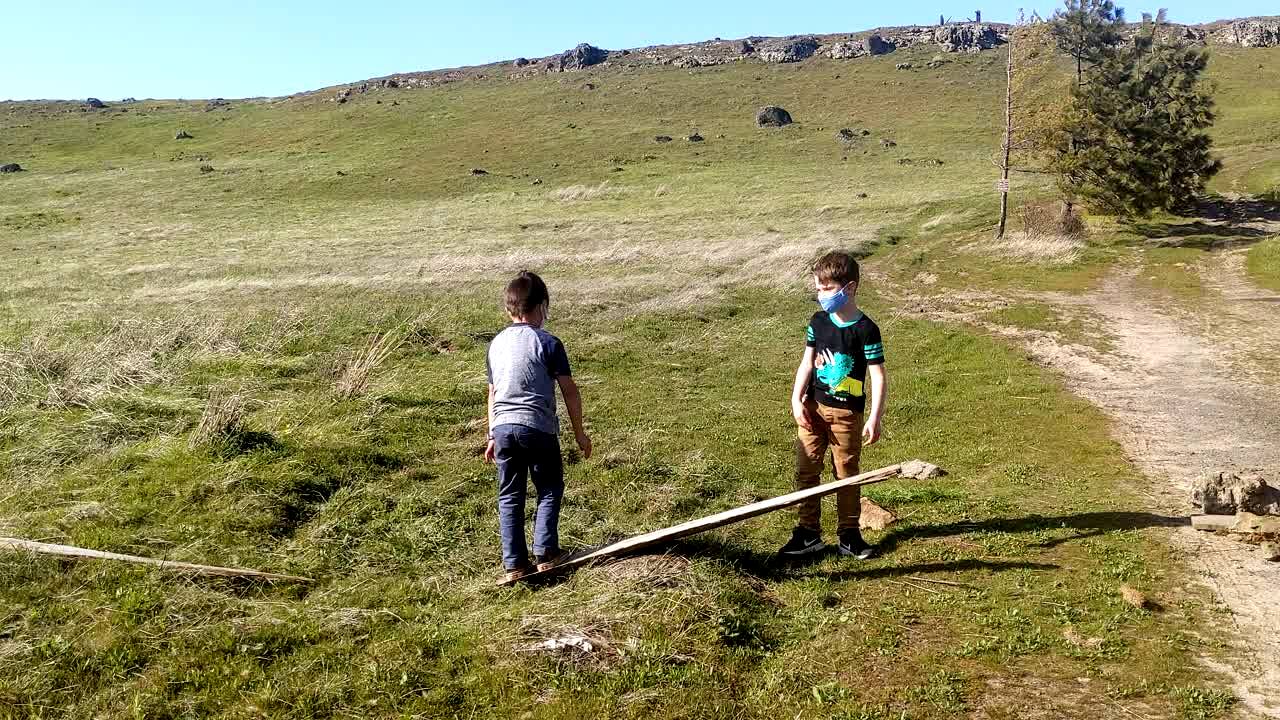 Two young boys jump on either side of a wooden plank and they both fall off of it outdoors.