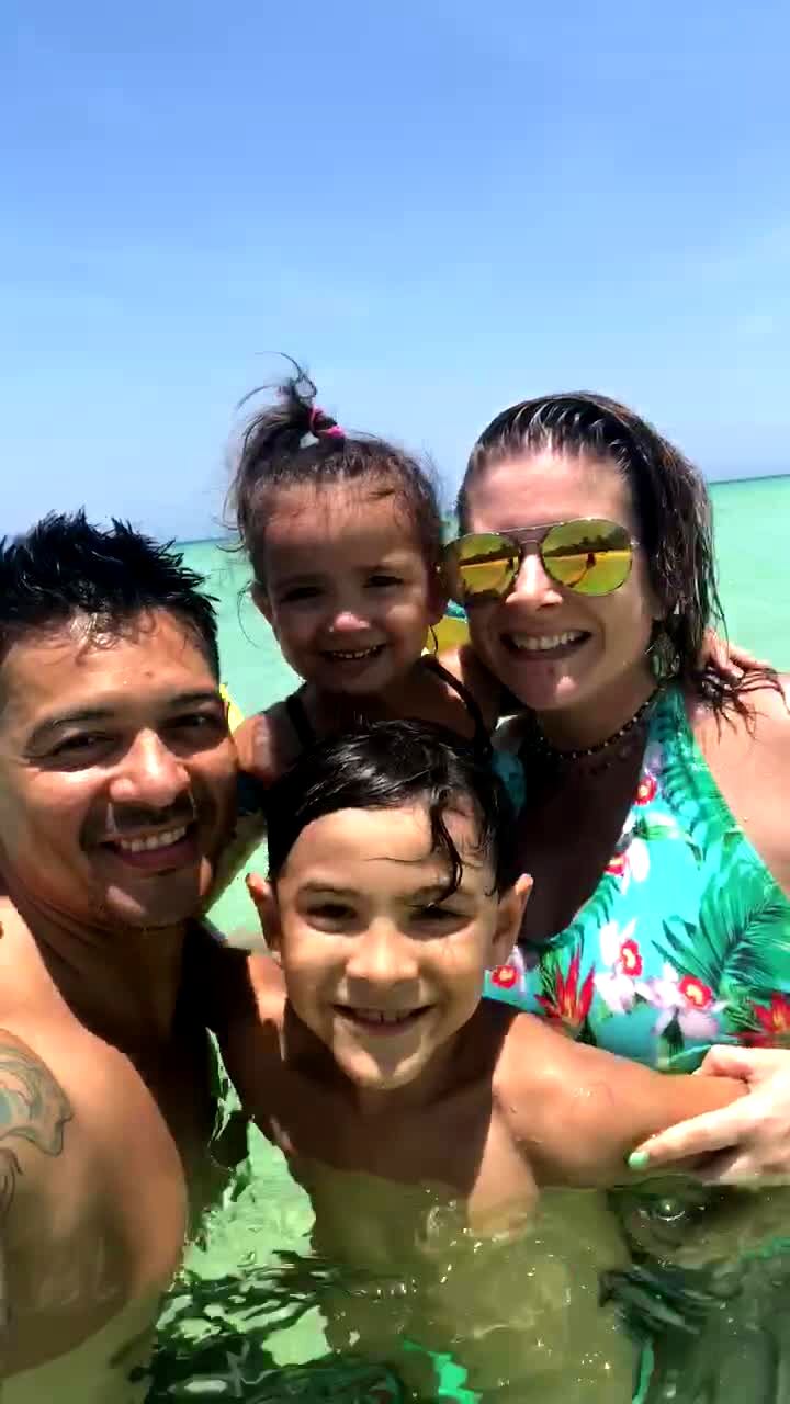 A family poses for a picture in the ocean, and a fish bites a young boy's nipple.