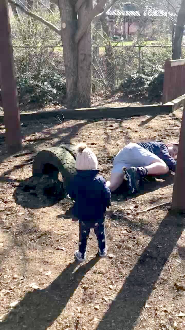 A man climbs on a playground zipline and it breaks. He falls on a tire on the ground and then bounces off and falls on the ground.