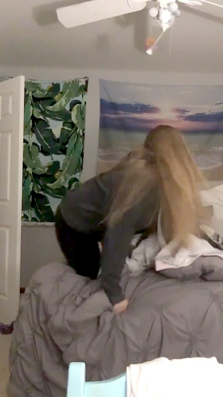 A teen girl dances on a bed in a bedroom and bumps her head into the ceiling fan light and breaks it and she falls off the bed. Music rights not cleared.