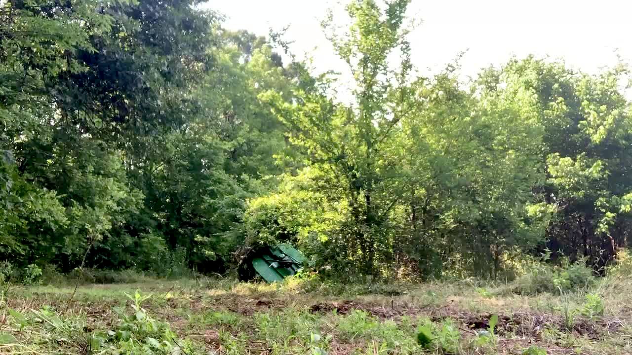 A man drives a tractor and uses it to clear a field and the tractor crashes and falls into a sink hole.